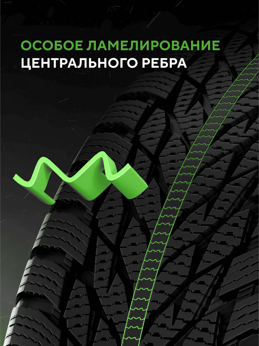 Снижение риска аквапланирования и улучшенное сцепление на скользких покрытиях обеспечиваются за счет ламелей-насосов, которые втягивают водную пленку с пятна контакта.
